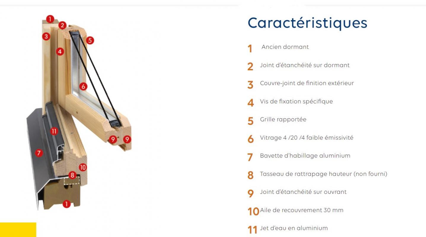 La robustesse des profils est évidente, avec une section de bois de 68 mm, sans pour autant laisser l’esthétique en berne : les lignes épurées et le parfait équilibre des masses de bois procure une élégance visuelle indéniable. La bavette d’habillage en aluminium (en neuf comme en rénovation) souligne et protège l’authenticité du bois. Des options de personnalisation sont possibles (petits-bois, crémones décoratives) ainsi que la teinte à choisir parmi plus de 200 nuances (finitions sous garantie Lenacolor 5 et 12 ans).