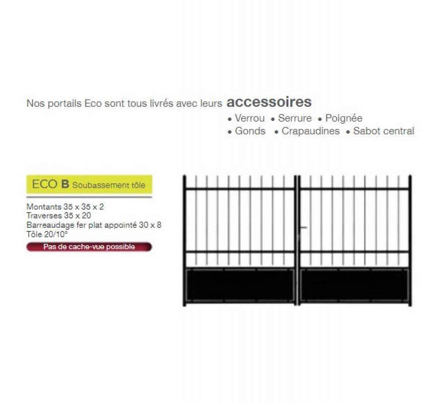 Le portail en fer ÉCO B est un choix idéal pour ceux qui cherchent à ajouter une touche de sophistication et de sécurité à leur propriété. Disponible en deux hauteurs de 135/165 cm et 165/195 cm, ainsi qu'en cinq largeurs différentes allant de 300 cm à 400 cm, ce portail est conçu pour s'adapter à une variété de configurations de propriété.