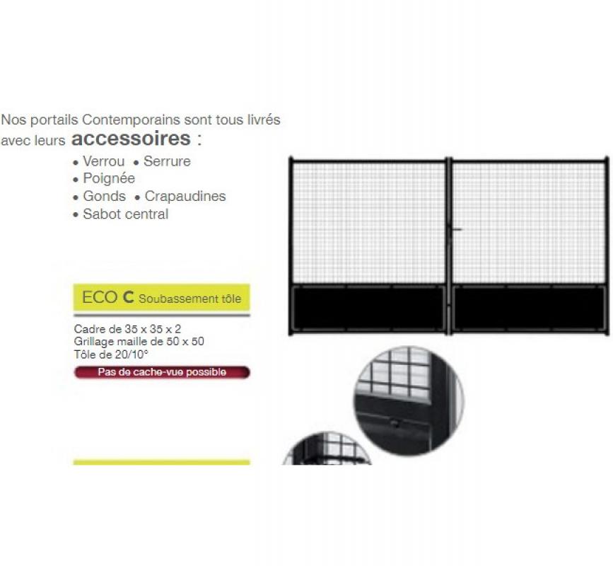 Le portail en fer ÉCO C est un choix idéal pour ceux qui cherchent à ajouter une touche de sophistication et de sécurité à leur propriété. Disponible en deux hauteurs de 135/165 cm et 165/195 cm, ainsi qu'en cinq largeurs différentes allant de 300 cm à 400 cm, ce portail est conçu pour s'adapter à une variété de configurations de propriété.