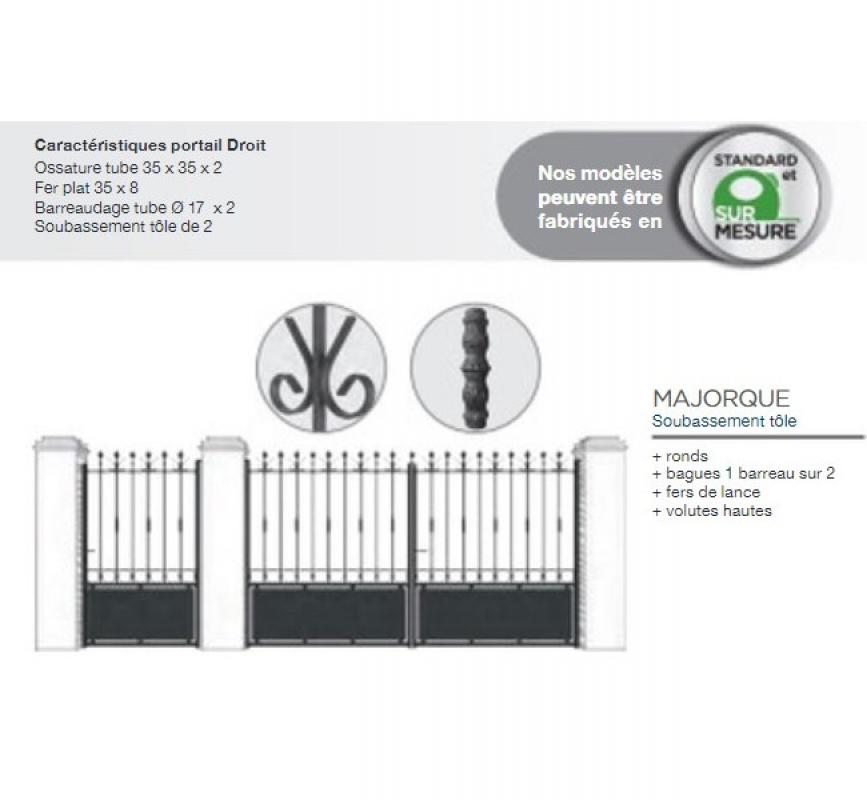 Le portail en fer MAJORQUE est un choix idéal pour ceux qui cherchent à ajouter une touche de sophistication et de sécurité à leur propriété. Disponible en deux hauteurs de 135/165 cm et 165/195 cm, ainsi qu'en cinq largeurs différentes allant de 300 cm à 400 cm, ce portail est conçu pour s'adapter à une variété de configurations de propriété.