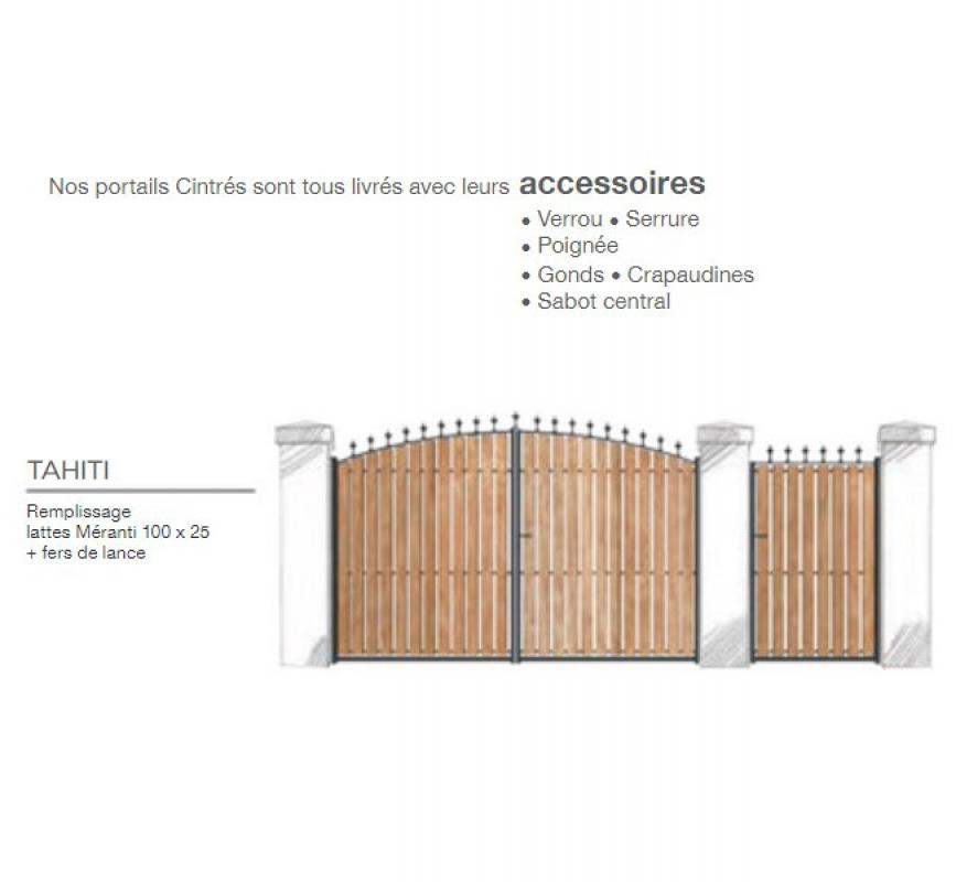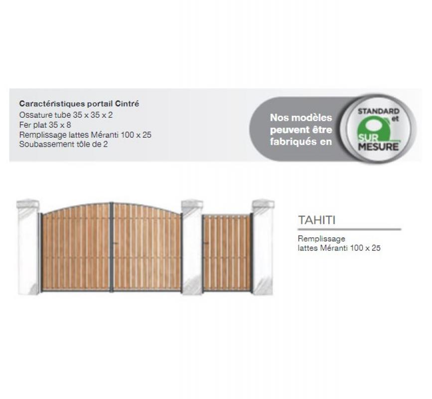 Le portail en fer TAHITI est un choix idéal pour ceux qui cherchent à ajouter une touche de sophistication et de sécurité à leur propriété. Disponible en deux hauteurs de 135/165 cm et 165/195 cm, ainsi qu'en cinq largeurs différentes allant de 300 cm à 400 cm, ce portail est conçu pour s'adapter à une variété de configurations de propriété.