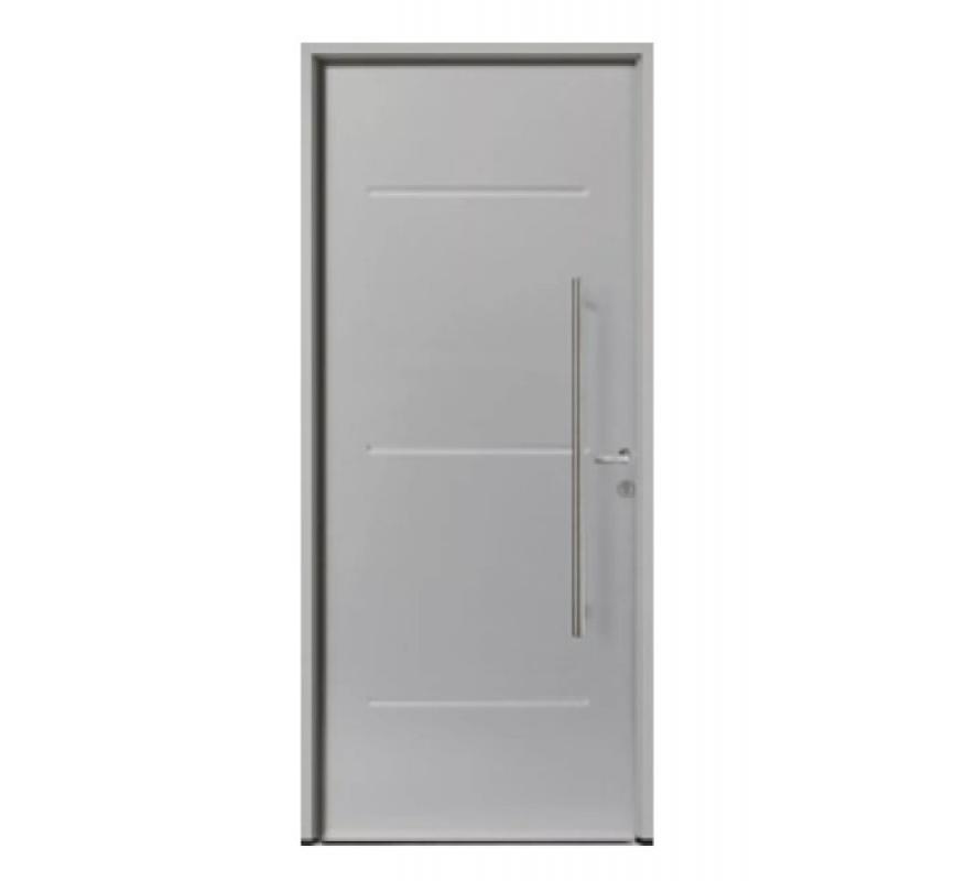La poignée courte et la barre de tirage extérieure facilitent l'ouverture de la porte, tandis que le traitement anti-corrosion de l'ouvrant en acier assure une grande durabilité. Les lignes en chevron, présentes sur les deux faces de la porte, lui confèrent une allure moderne et stylisée.